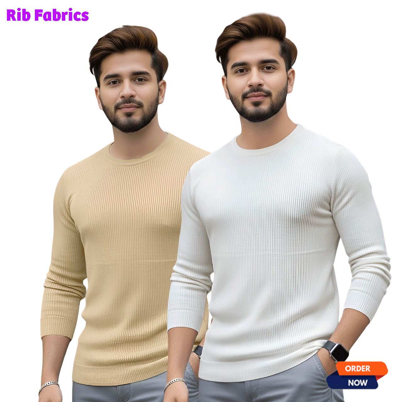 2 Pcs Men’s Premium 2/2 Rib Full Sleeve T-shirt – White+ Cream